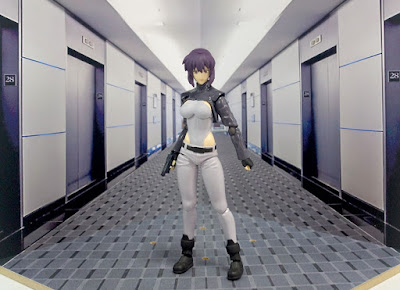 アニメの攻殻機動隊で印象的なシーンとしては少佐が光学迷彩を使ってビルから飛び降りるシーンですが、他のフィギュアでは使えなさそうなのでエレベーターホールの背景セットにしました。